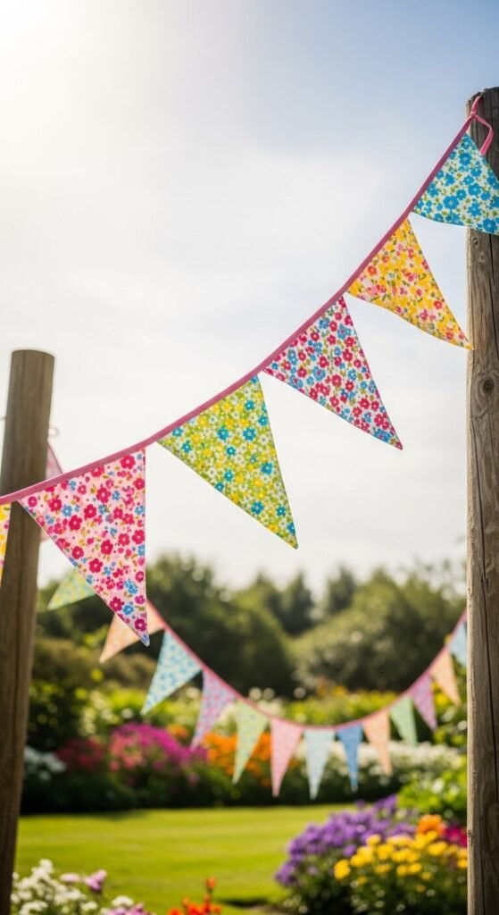 Bunting flags bring color and movement to your space. You can buy pre-made fabric bunting or cut your own triangles from cotton fabric scraps and string them on twine — no sewing required. Floral prints, gingham, or solid pastels all work well for a garden setting. Hang them between trees, across a porch railing, or above your food table. A 15-foot strand of bunting costs around $10 to make yourself. It’s one of the most affordable ways to fill vertical space.