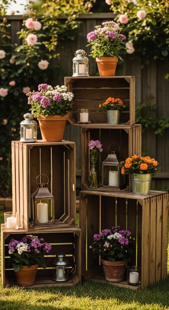 Wooden crates are one of the most useful decor tools you own. Stack them at different heights to create a tiered display for food, flowers, candles, or favors. They’re rustic, sturdy, and look great with almost any garden party theme. Check thrift stores or ask at local grocery stores — produce crates are often free or very cheap. Line them with fabric or burlap if you want a softer look. Use them under a dessert table or near your drink station for instant style.
