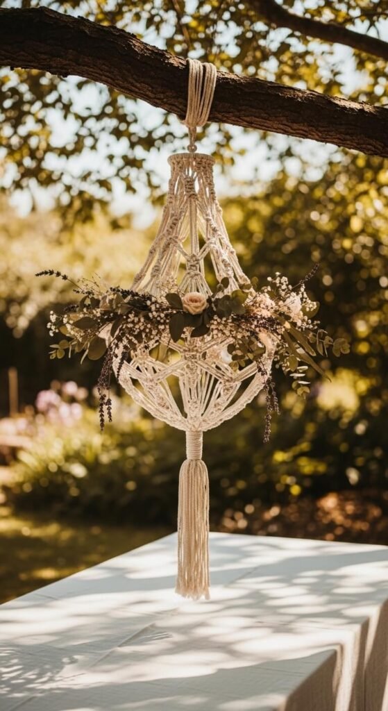 A hanging installation above your dining table creates a real focal point. A macramé or floral chandelier hung from a tree branch adds height and drama without blocking conversation. You can buy pre-made macramé pieces on Etsy for $30 to $50 or make a simple version with rope and a metal ring. Weave in dried flowers, ribbon, or eucalyptus. It turns the space above your table into something guests look up at and comment on. Takes about an hour to assemble.