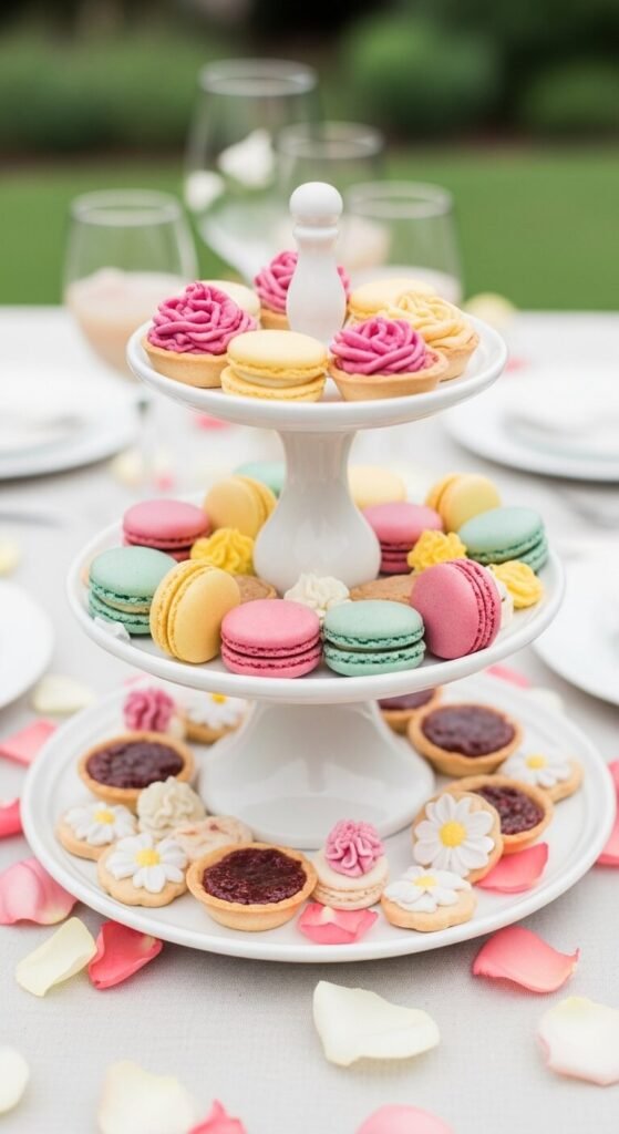 Your dessert table is a decor moment, not just a food station. A tiered ceramic or wooden stand stacked with small treats draws the eye immediately. Style around it with scattered flower petals, small candles, and a pretty label or sign. Use varying heights — some items elevated, some flat on the table — to create dimension. You don’t need a baker. Store-bought cookies, chocolates, and macarons arranged well look just as beautiful as anything custom-made.