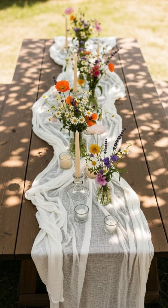 Fabric runners instantly dress up any table. Cheesecloth is the current favorite — it’s inexpensive, comes in huge rolls, and the gauzy, slightly imperfect drape looks relaxed and beautiful outdoors. Cut it to length and layer it loosely down the center of your table. Linen runners work for a cleaner, more polished look. Either way, a fabric runner makes your florals and candles sit within a cohesive visual frame. One roll of cheesecloth (about 20 yards) costs around $8 online.