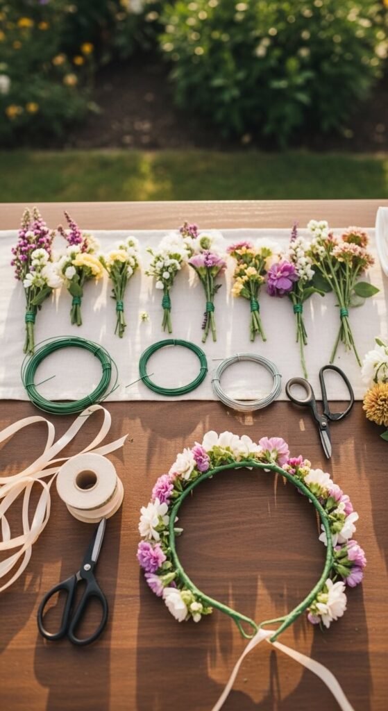 A flower crown activity station is decor and entertainment combined. Set out floral wire, tape, ribbon, and small bunches of flowers. Guests make their own crowns during the party. It’s hands-on, it’s photogenic, and people absolutely love it. Keep flower choices simple: baby’s breath, daisies, and small filler flowers work best for beginners. Label each element with small tent cards. The station itself looks beautiful as a display even before anyone uses it.