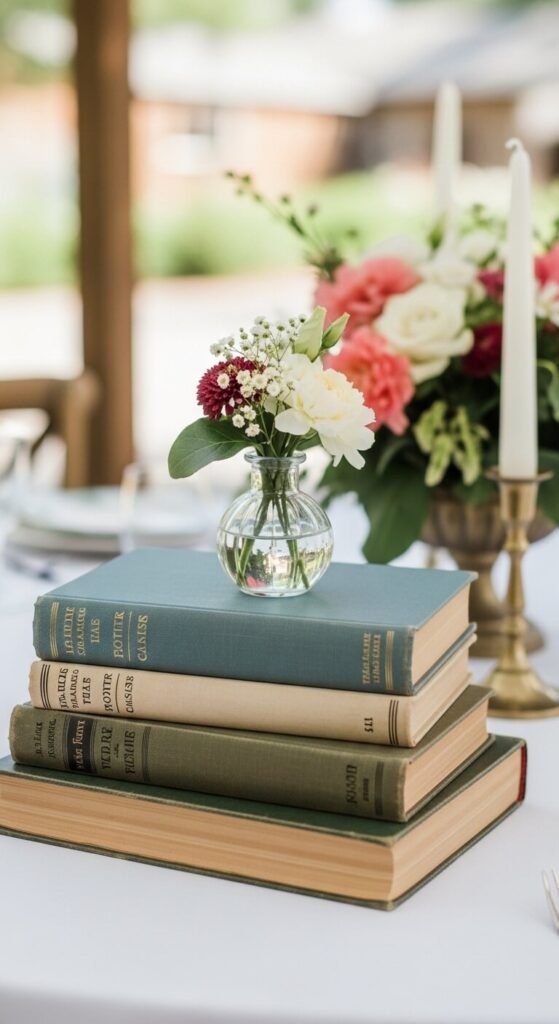 Old books add an unexpected intellectual charm to garden party tables. Stack two or three vintage hardbacks and place a bud vase or candle on top as a riser. The aged spines add color and texture without spending anything — most come from thrift stores for under a dollar each. Choose books with pretty spines in complementary colors. They also spark conversation. Guests always pick them up and look at the titles, which creates those natural, relaxed moments between people.
