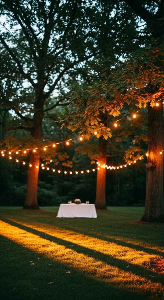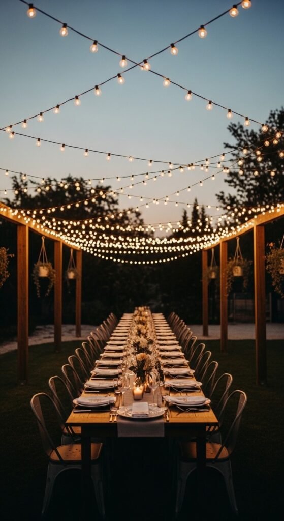 A grid canopy of fairy lights directly above your dining table creates an intimate ceiling of light. Attach four wooden posts or use existing fence posts to create a frame, then string the lights back and forth across the top. This works beautifully at dusk and well into the evening. Add a few hanging planters or lanterns at the corners to complete the look. It takes about 90 minutes to set up but completely transforms an ordinary outdoor table into a magical dining experience.