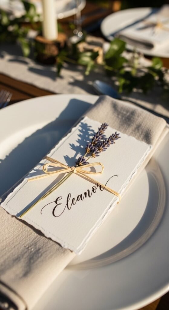 Place cards make guests feel thought about. Attach a small sprig of dried lavender or rosemary to each card with twine for a garden-appropriate finishing touch. Write names in a simple calligraphy style — even a basic handwriting style on thick card stock looks lovely. You can also tuck them into napkin folds or lean them against glasses. The whole set costs under $5 for 20 guests. Small gestures like this are what guests remember long after the party ends.