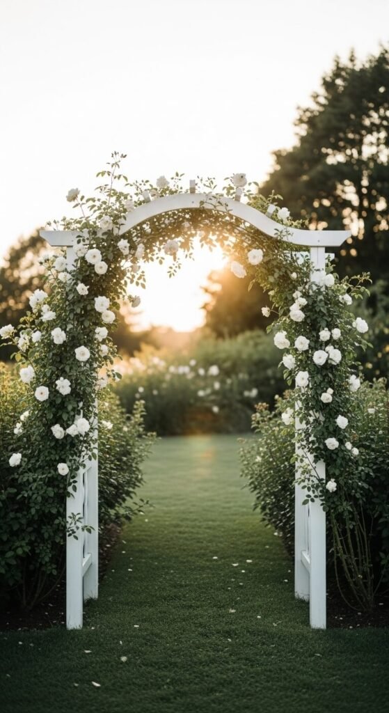 A wooden arch or arbor becomes your party’s anchor point. Drape it with climbing vines, fabric, or fairy lights to make it a true focal piece. Place it behind your main table or at the entrance. You can find freestanding arches at garden centers for $50 to $80, or build a simple one with wood stakes and crossbeams. Wrap it with eucalyptus garland and add a few hanging lanterns. Every guest will walk under it and stop to take a photo.