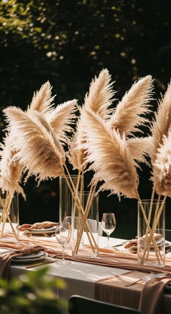 Pampas grass has a soft, feathery texture that moves beautifully in a garden breeze. Place tall stems in simple glass or ceramic vases for an effortless, contemporary centerpiece. It works equally well on tables, near entrances, or beside a dessert station. Dried pampas grass lasts indefinitely, so you can buy it well before your event. A bundle of stems costs around $15 online or at a craft store. It’s one of those pieces that looks much more expensive than it is.