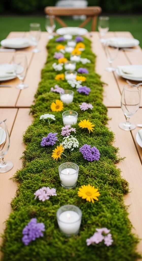 A living moss runner down the center of your table looks like something from a magazine editorial — but it’s shockingly easy to pull off. Buy a flat of sheet moss from a garden center (usually around $8 to $12), lay it directly on your table, and tuck in candles and flower stems. It smells clean and earthy and photographs beautifully. Keep it misted lightly to stay fresh throughout the party. After the event, repot it or use it in your garden.