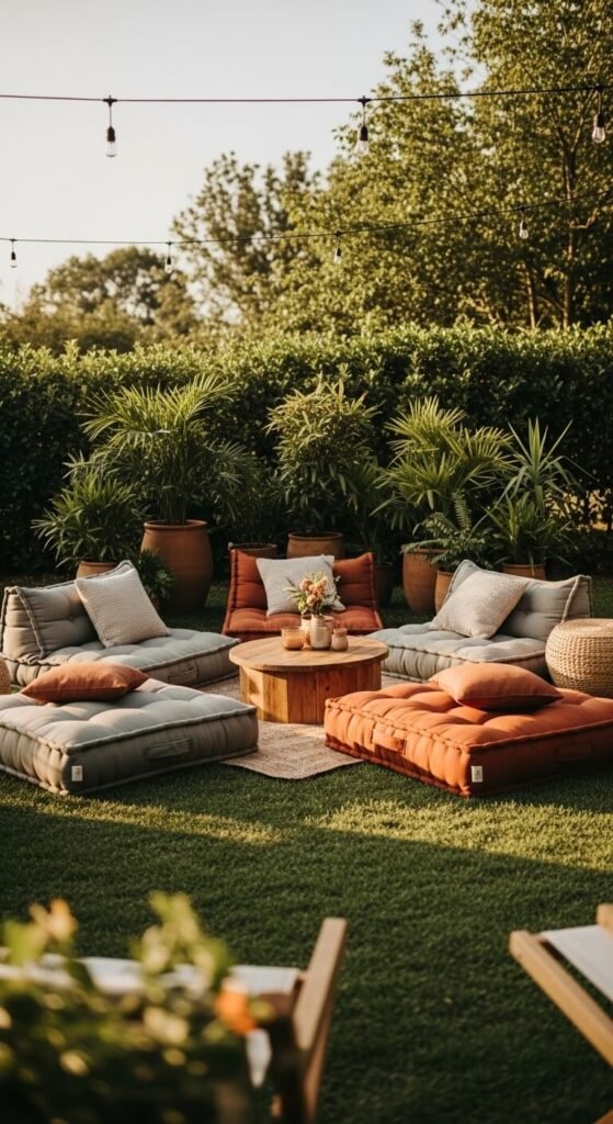 Not every guest wants to sit at a table. Create a lounge zone with oversized floor cushions around a low table or coffee table. This area becomes a natural conversation hub. Use outdoor-friendly cushions in muted, earthy tones — terracotta, sage, and cream work well together. Add a woven rug underneath to define the space on grass. This setup costs very little if you already own throw pillows, and guests always gravitate toward it.
