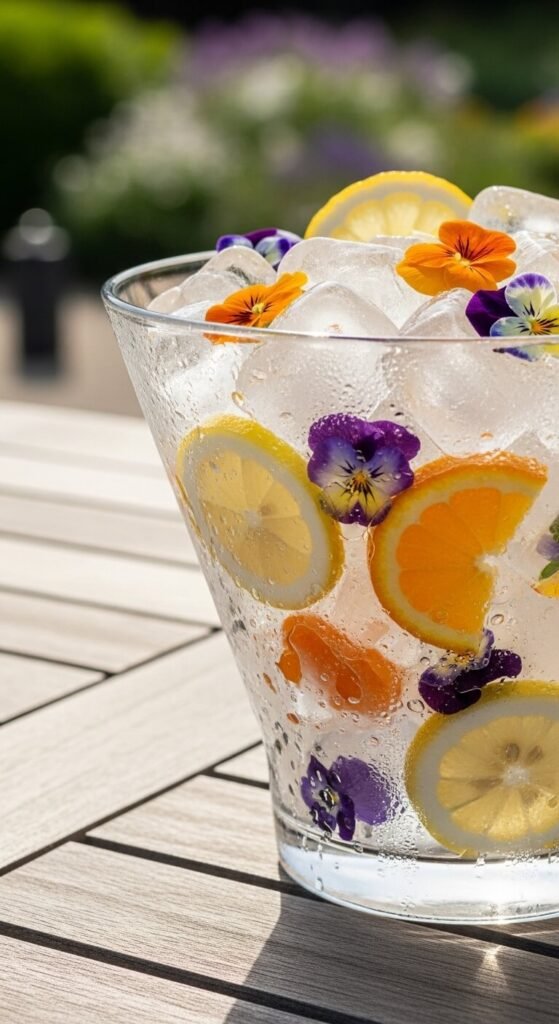 Freeze fruit slices and edible flowers into a large ice block inside a bundt pan or bowl. Use it as a decorative ice bucket to chill wine or a punch bowl. Fill the pan with water, drop in lemon slices, pansies, or strawberries, then freeze overnight. The result looks stunning — especially as it slowly melts in the sun and releases the flowers. This is one of those ideas that costs almost nothing but creates a real wow moment on your drink table.