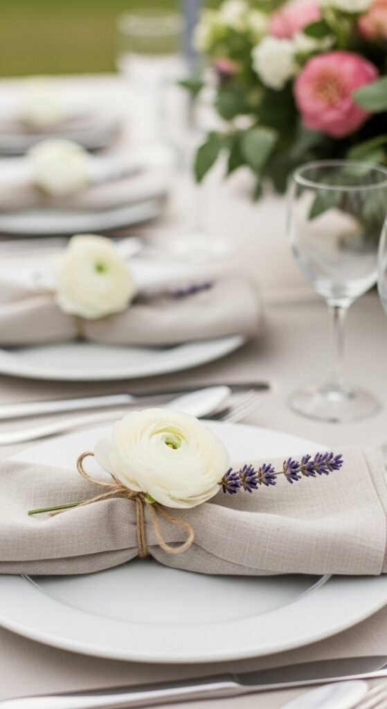 This is one of the smallest changes you can make with the most visual payoff. Tie each napkin loosely with twine and tuck in a single bloom or herb sprig. Ranunculus, sweet peas, or lavender all work perfectly. It takes about 20 minutes to do for a table of 10. It signals care and attention to detail, which guests immediately feel even if they can’t pinpoint why. This is also a great use for extra flowers leftover from centerpiece arrangements. Nothing gets wasted.