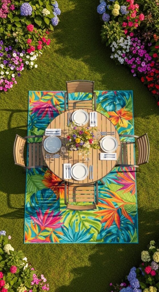 An outdoor rug on grass is one of the most underused tricks in garden party decor. It immediately defines a “room” within your open outdoor space. Use a bold botanical print or a classic stripe in colors that match your palette. Rugs anchor your seating area and make the setup feel designed and thought-through rather than just chairs placed randomly on a lawn. You can find durable, weather-resistant outdoor rugs on Amazon for $30 to $60 in a range of sizes.