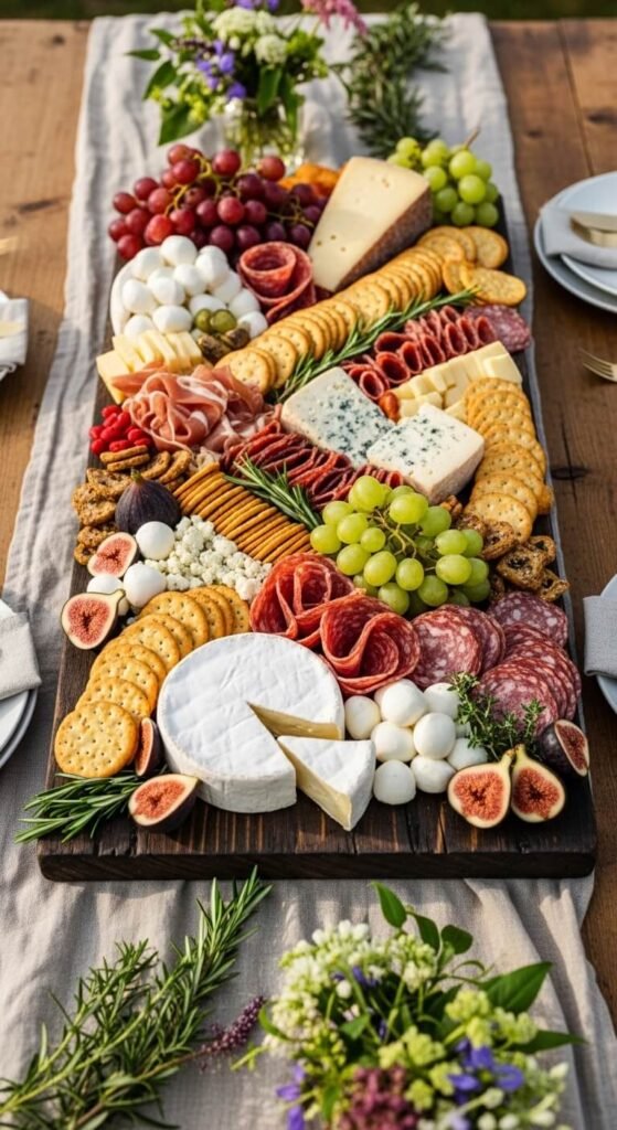 A large grazing board placed in the center of your table is decor and food at once. Cover a wide wooden board with cheeses, fruits, crackers, dips, and fresh herb garnishes. Tuck in small edible flowers or rosemary sprigs to blur the line between food and floral design. It’s visually abundant and guests graze from it naturally throughout the event. This removes the need for a separate appetizer course and saves you time. Style it 15 minutes before guests arrive.