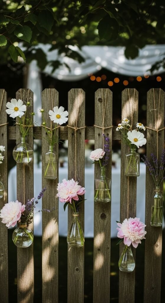 Turn an ordinary fence into a floral installation using empty glass bottles hung with twine. Wrap twine around the neck of each bottle, secure it, and nail a simple hook to the fence. Drop a single flower stem into each bottle with a little water. Vary the heights and flower types for a collected, organic look. Collect wine bottles, milk bottles, or bud vases over several weeks before your party. This whole installation can cost under $10 and looks genuinely artistic.