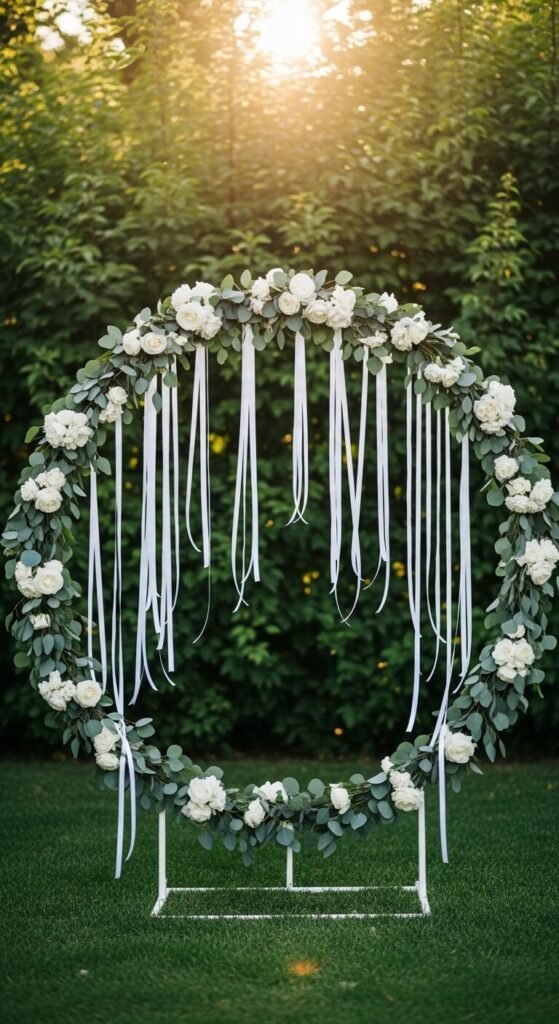 A floral hoop is a modern, minimal take on the flower wall backdrop. Take a large metal ring (a macramé hoop from a craft store works perfectly) and wrap it with eucalyptus, ribbon, and a few blooms at the base. Lean it against a hedge or fence as a photo prop. Guests step in front of it naturally. It takes about 30 minutes to make and costs around $20 in supplies. The photos guests take in front of it are always stunning — and that’s the best party favor you can give.