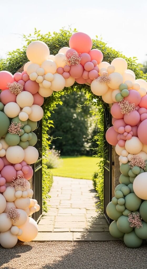 A balloon arch at your garden entrance sets the tone immediately. Organic-style arches — where balloons are different sizes and loosely arranged — look far more current than the old-school grid style. Stick to a two or three color palette that matches your theme. You can buy a DIY arch kit for around $25. Add a few sprigs of dried pampas or eucalyptus between the balloons to make it feel more garden-appropriate and less like a birthday party.
