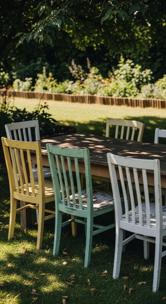 Nothing makes a garden party feel more charming than chairs that don’t match. Hit thrift stores or Facebook Marketplace for old wooden chairs and paint them in soft pastels — sage, blush, pale yellow. They don’t need to be perfect. The slight variations add personality. This works especially well for bridal showers, afternoon teas, or birthday parties. Gather six to eight chairs over a few weeks before your event and you’ll have a curated, collected look for almost no money.