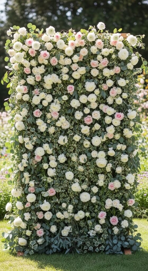 A flower wall gives guests an automatic photo opportunity — and they love it. Build a simple wooden frame from garden stakes or PVC pipe and attach faux or fresh flowers using floral wire or a hot glue gun. Faux florals are the smarter choice here — they hold up in heat and you can reuse them. Focus on one corner of your garden for maximum impact. Even a 3×4 foot section is enough to create a stunning backdrop.