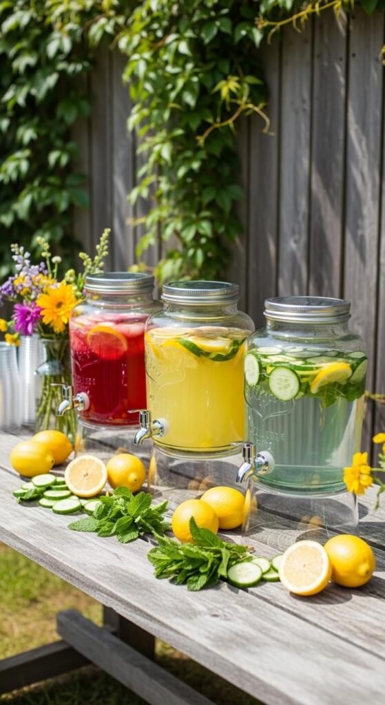 A styled drink station is decor AND function in one. Use glass drink dispensers on a wooden cart or folding table covered with linen. Add a chalkboard label, a bucket of ice, and fresh garnishes like lemon slices, mint, or berries. It looks intentional and gives guests something to gather around. Stack some patterned paper cups or bring out your mismatched vintage glasses. The whole setup costs very little but looks like something out of a magazine.