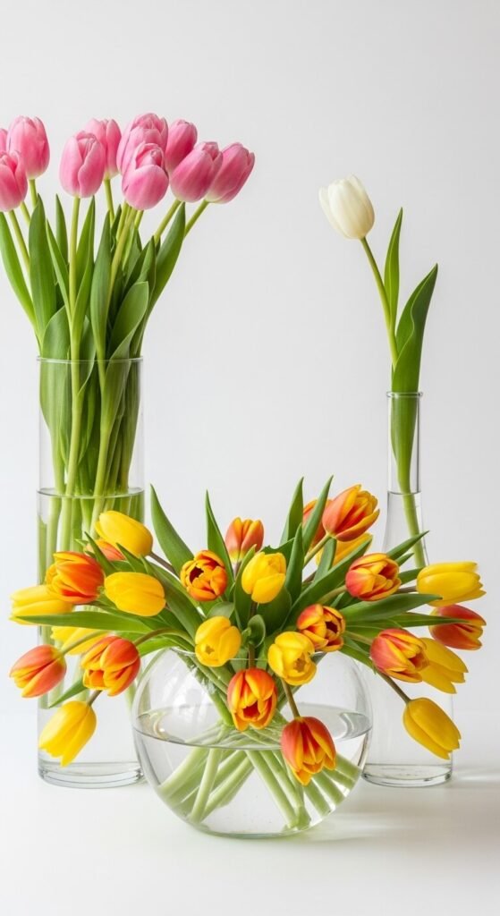 Your vase choice makes a huge difference in keeping tulips upright. Here’s what works best: