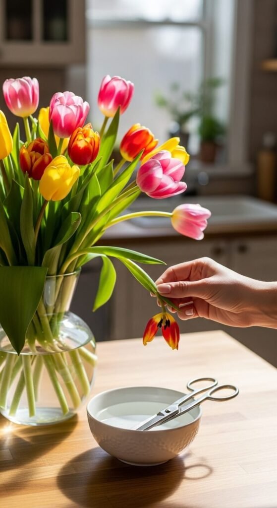 Here’s a game-changer: put your arranged tulips in the refrigerator overnight (away from fruit). This slows their growth and keeps stems firmer. Just bring them out during the day to enjoy!