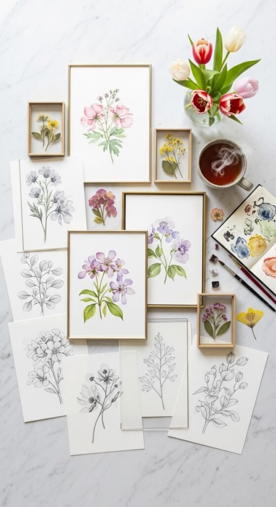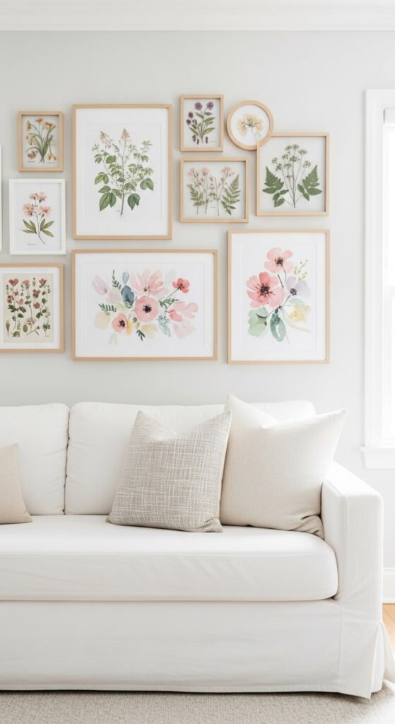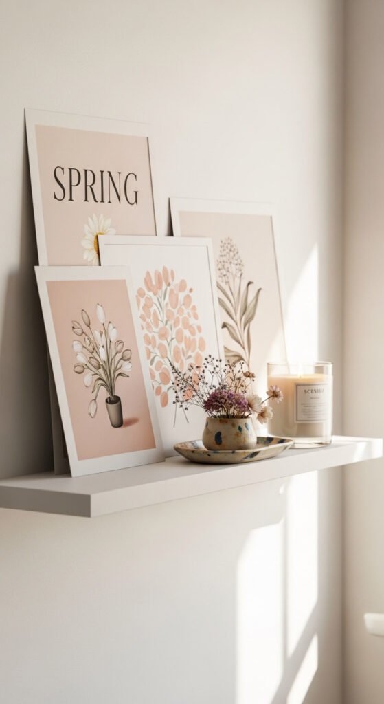 Now for the fun part — choosing what goes inside those frames. For spring, think light, airy, and nature-forward. Here are some ideas that display beautifully: