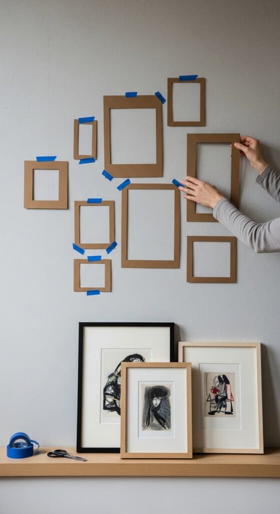 - Trace each frame onto kraft paper, cut out the shapes, and tape them to the wall with painter’s tape.