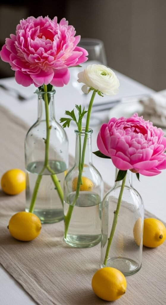 - Bud vases in a row: Gather mismatched vintage bottles or simple glass vases and fill each with single stems of seasonal flowers like tulips, daffodils, or ranunculus