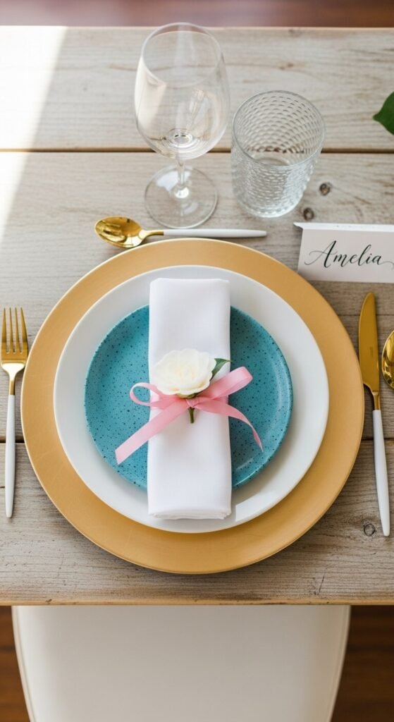 Choose 2-3 main colors and stick with them throughout your napkins, flowers, and decorative elements. This creates cohesion without looking overly matched.