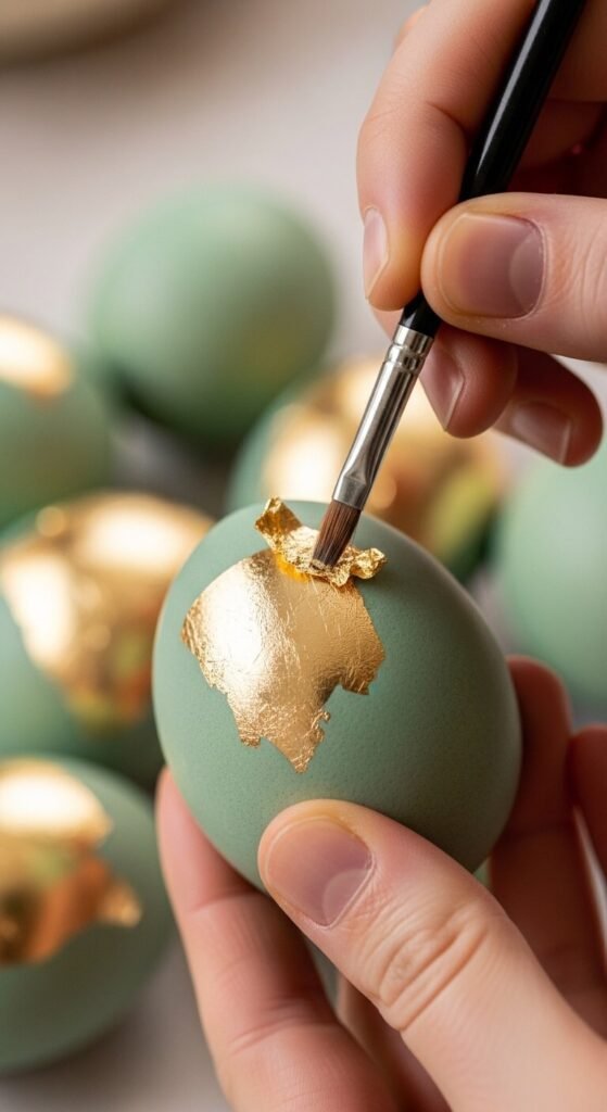 - Apply gold leaf to sections of the egg for luxe accents