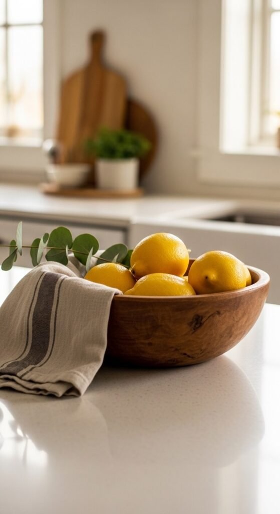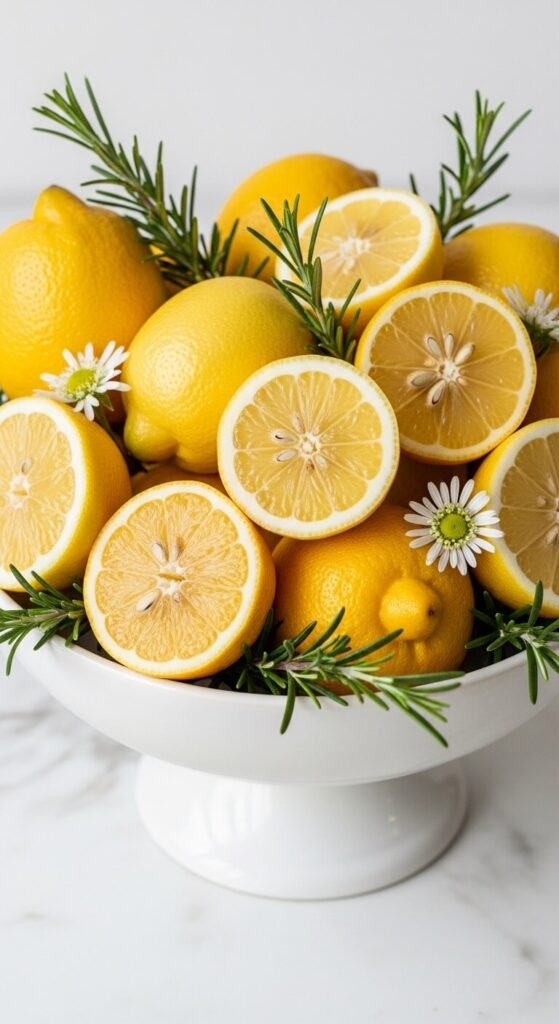 - Choose the right vessel: White ceramic, terracotta, woven rattan, or aged wood all complement lemons beautifully.