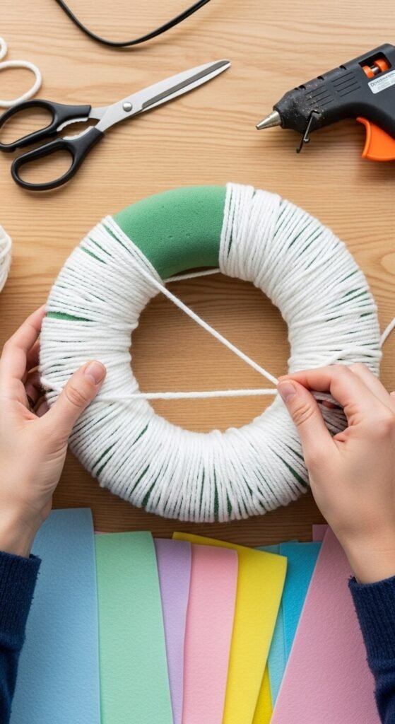 Start by wrapping your wreath form. If you’re using a grapevine wreath, you can skip this step since the natural texture adds a lovely rustic look on its own. For a foam wreath, wrap it tightly with white yarn or strips of faux fur fabric, securing as you go with hot glue.
