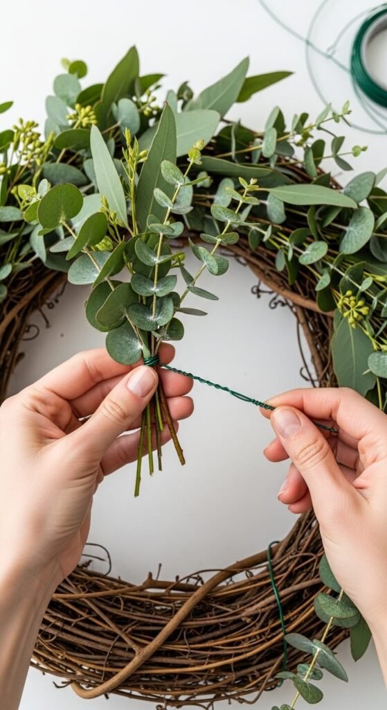 Layer 1: The Greenery Base Start by attaching your greenery all around the wreath, working in one direction. Use eucalyptus, ferns, or lambs ear to create a lush foundation. Secure with floral wire, not hot glue (it’ll look cleaner and last longer).