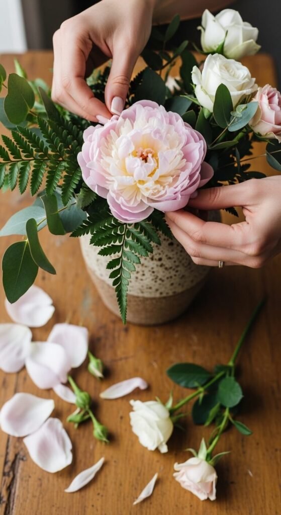 Step 2 — Add focal flowers. Position them at varying heights — don’t line them up at the same level. Odd numbers (3 or 5 blooms) look more natural than even groupings.
