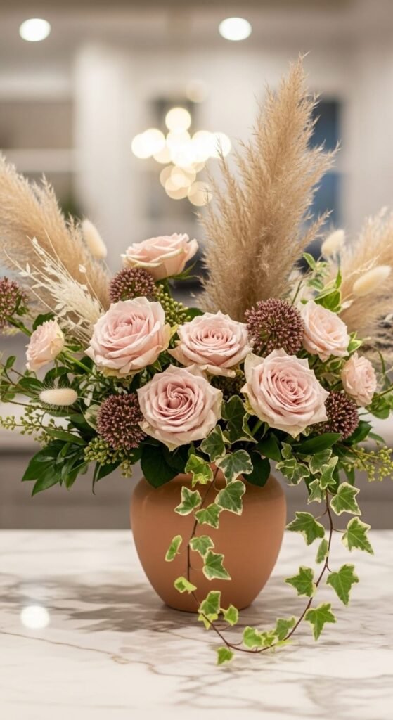 Add unexpected textures — a sprig of berries, a cotton stem, or dried grasses can add serious personality