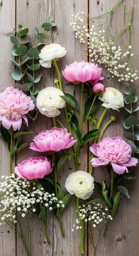 Focal flowers — the showstoppers. Think peonies, roses, sunflowers, or dahlias. These are your statement pieces.