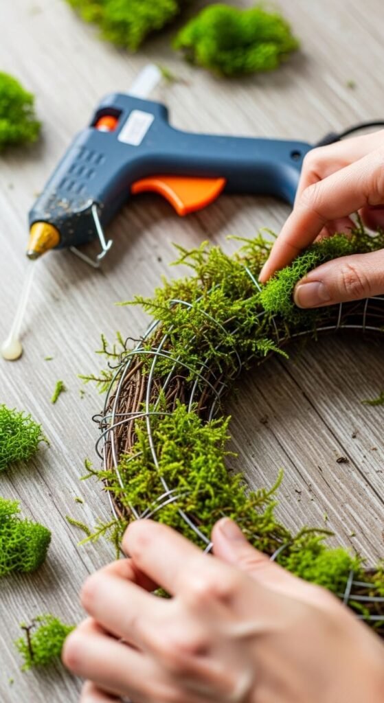 Apply a generous line of hot glue to your wreath form, then press a moss piece firmly onto it for 10–15 seconds.