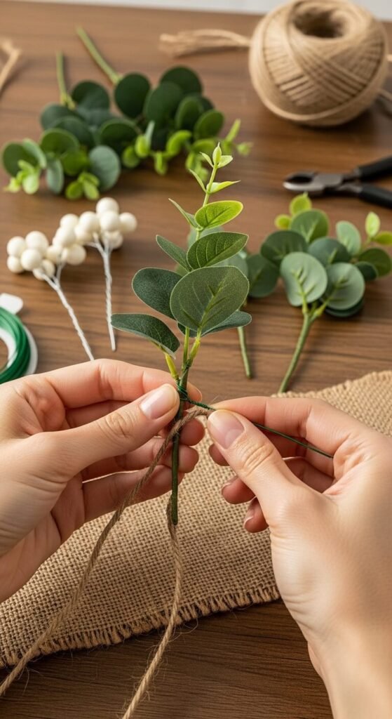Begin with your greenery as the base layer. Space eucalyptus or fern stems along your twine, alternating the direction they point (some left, some right) to create fullness. Secure each piece with floral wire, wrapping it tightly around both the stem and the twine.
