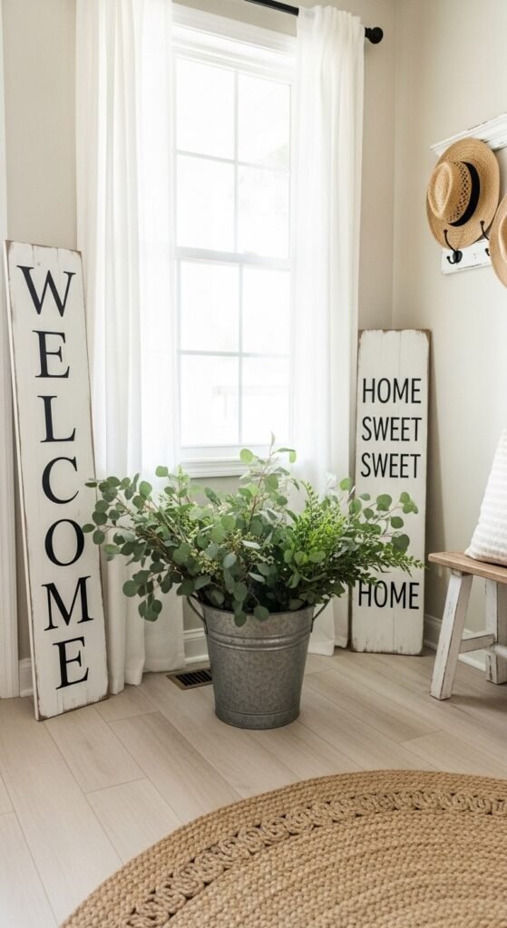 You don’t need fancy equipment to create those charming farmhouse signs everyone loves. Grab some scrap wood (check construction sites, pallets, or your garage), sandpaper, and leftover white paint.