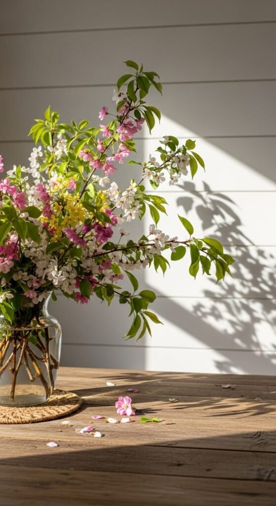 Arrange branches in vintage mason jars or thrifted pitchers for instant farmhouse charm. The best part? It costs you absolutely nothing, and it brings genuine spring freshness indoors.