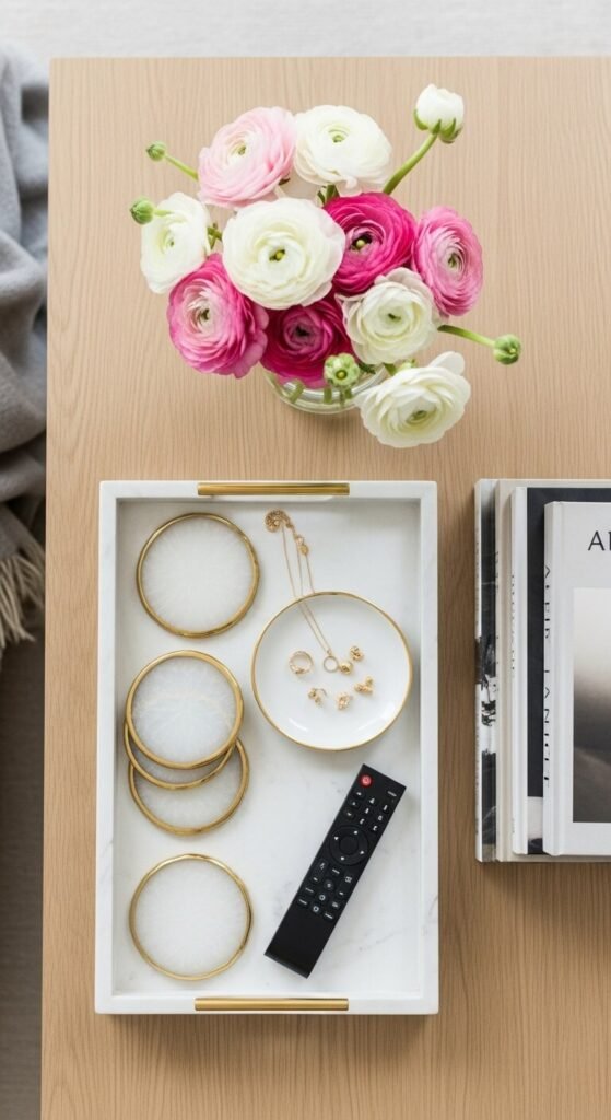 Formula 2 (Layered): Decorative tray + small plant + decorative object + coasters