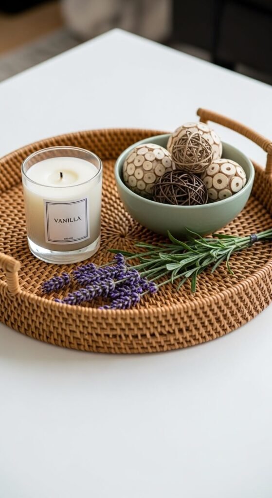 Inside your tray, group 2-3 small items like a candle, a small bowl, and a decorative object. This keeps things from looking cluttered while still filling the space beautifully.
