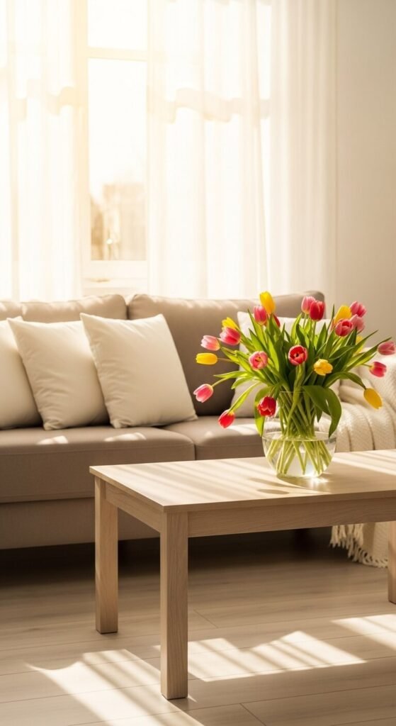 Open your windows (weather permitting!) and let fresh air circulate. You’d be amazed how much this simple act can shift the energy of a room. While you’re at it, wash your curtains, dust those overlooked corners, and vacuum under furniture. A clean canvas makes every spring accent shine brighter.